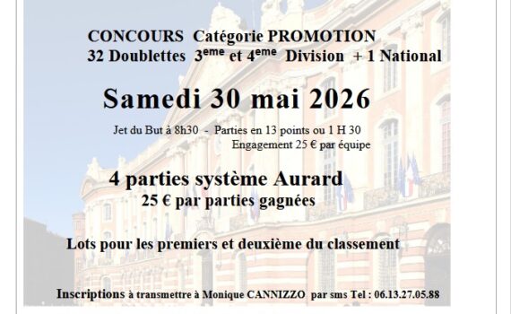 Une liste d’attente est prévue, faite vous inscrire sur cette liste d’attente en cas de désistement Tel : 05.61.58.17.63. Tél : 06.13.27.05.88 www.club-bouliste-toulousain.com