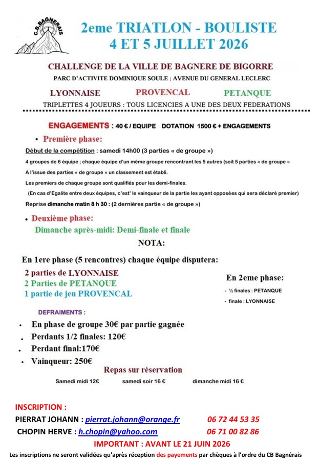 A la une Accueil Concours BAGNERE DE BIGORE 2ème TRIATLON 4&5 Juillet 2026 Publié 6 janvier 2026 TRIATLONTélécharger Voir les hébergementsTélécharger