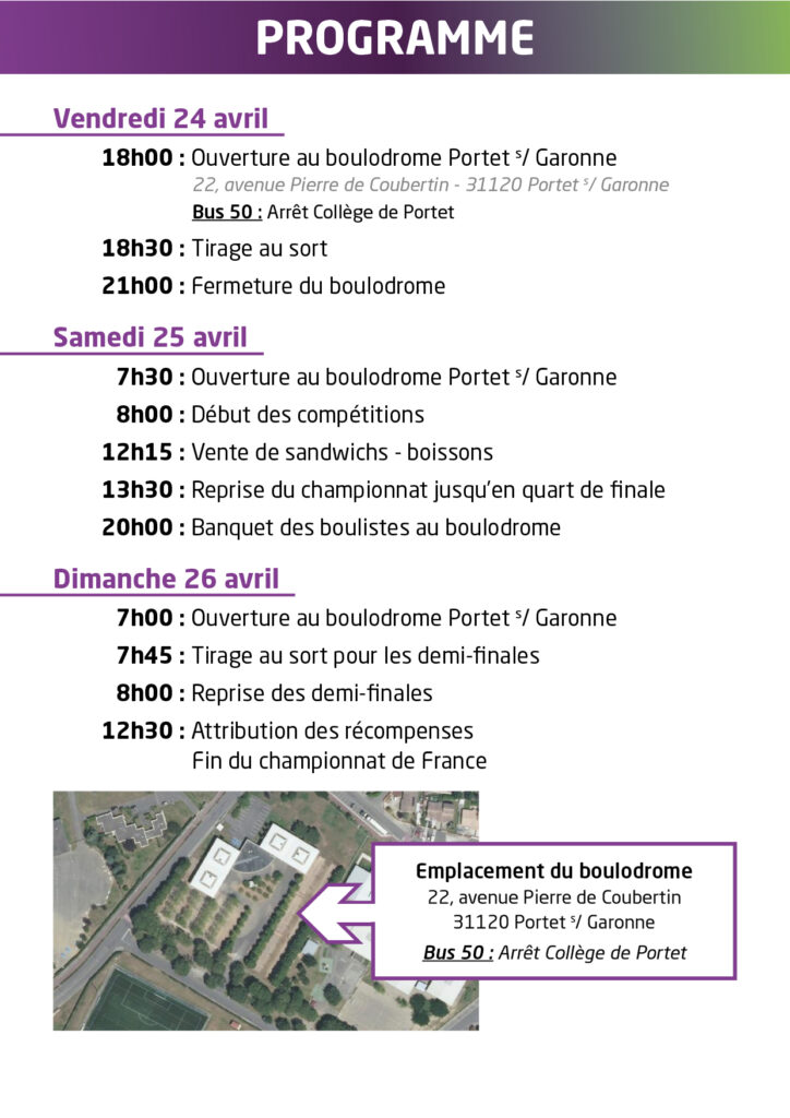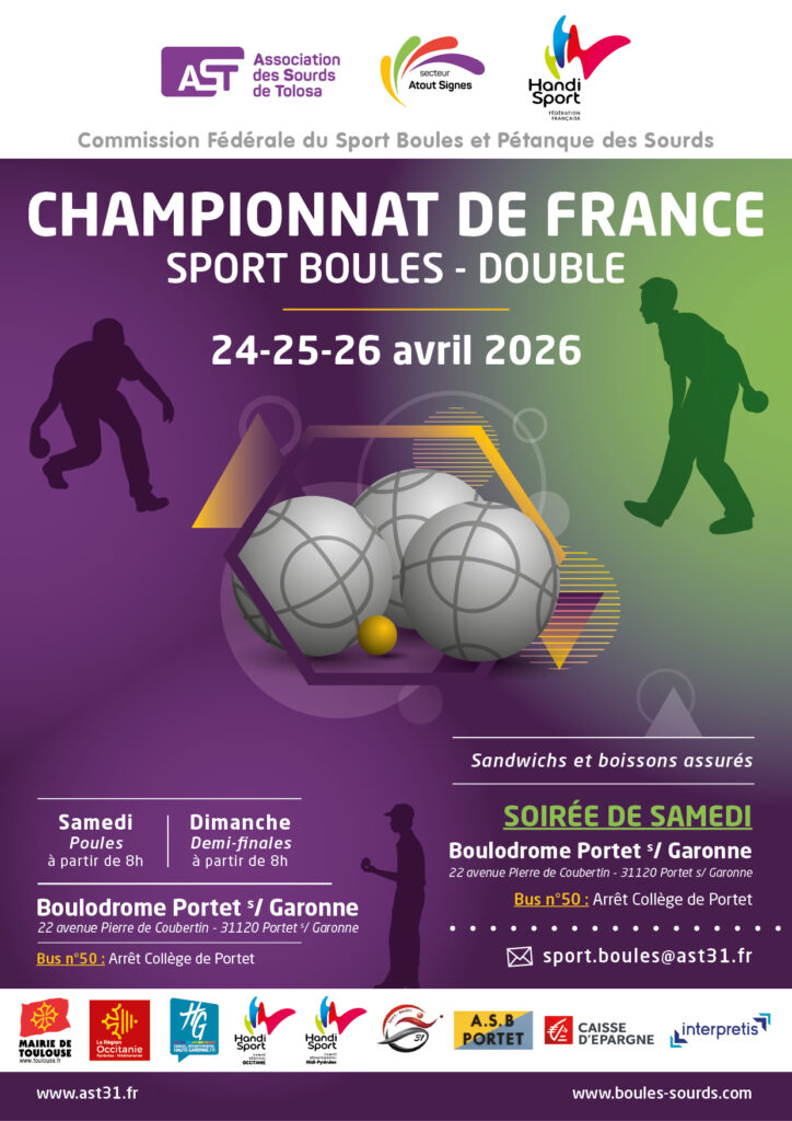A la une Accueil Championnats de France Championnat de France Sport Boules Double 24-25-26 Avril à Portet/Garonne Publié 17 avril 2026