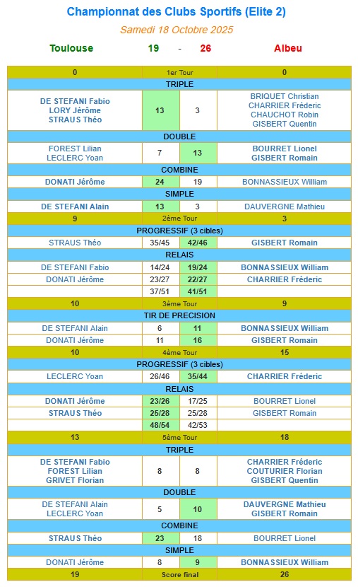 Déchainés, les lyonnais enregistrent ensuite 5 victoires consécutives (tir progressif / tir en relais / 2 tirs de précisions ainsi que le 2ème tir progressif) pour rejoindre les Toulousains et creuser l’écart pour mener 18-10. Le relais toulousain stoppe enfin l’hémorragie avec une performance très correcte de 48/54) pour entretenir l’espoir de renverser la vapeur lors de l’ultime tour. Revenus 13-18, la marge de manœuvre reste étroite et nécessite de remporter les 4 épreuves restantes sous peine de voir les lyonnais remporter le gain du match en grappillant les bonus défensifs. Le combiné permet de réduire l’écart et à 6mn de là fin du temps règlementaire, les 3 parties restantes sont serrées : 7-8 en triple / 8-8 en simple et 5-7 en double. Au final, les Toulousains arracheront le match nul en triple mais échoueront en simple et double. L’ALBEU scelle le match 26-19.