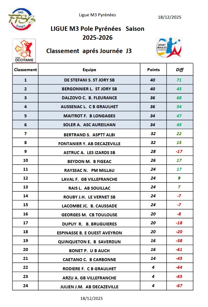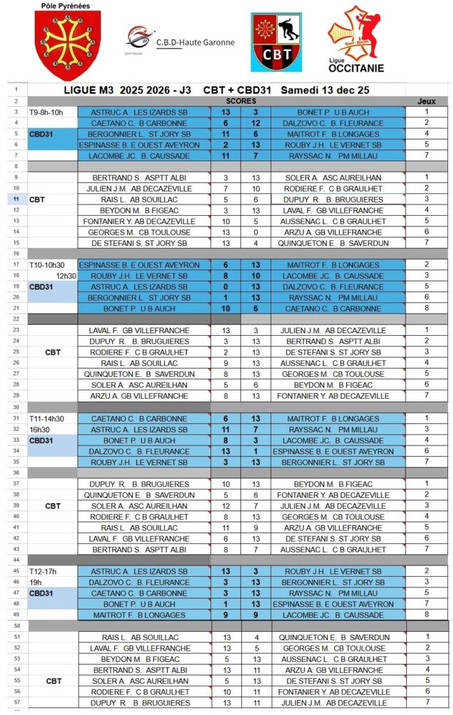 A la une Accueil Ligue Ligue M3 – Journée3 – le 13 Décembre 2025- CBD31& CBT Publié 10 décembre 2025 Un clique droit sur l’image enregistré ou ouvrir nouvel onglet ——————————————————————— Résultats J3 Ligue M3 CBT&CBD31 Lien: Journée 4 – 13 Février 2026 Montauban 82 Journée 5 – 7 Mars 2026 Albi 81 Journée 6 – 5 Avril 2026 journée à définir