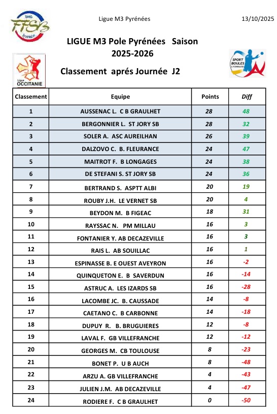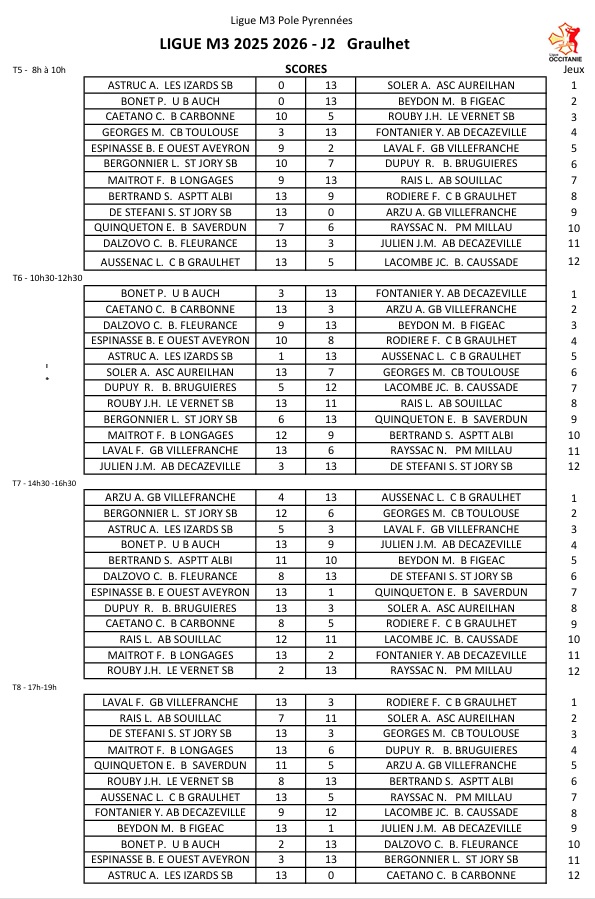 A la une Accueil Ligue Ligue M3 – Journée3 – le 13 Décembre 2025- CBD31& CBT Publié 10 décembre 2025 Journée 4 – 13 Février 2026 Montauban 82 Journée 5 – 7 Mars 2026 Albi 81 Journée 6 – 5 Avril 2026 journée à définir