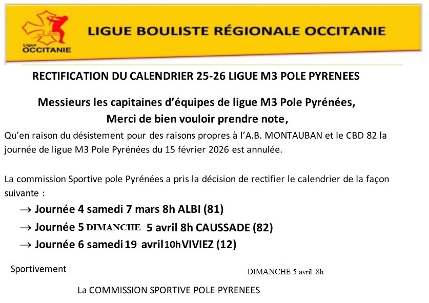 A la une Accueil Ligue Ligue M3 Sport Boules les prochaines dates Pole Pyrénées 2026 Publié 27 janvier 2026